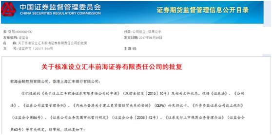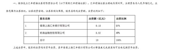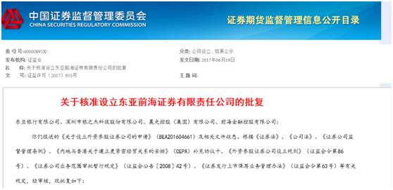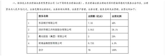 同样在6月19日,证监会核准设立东亚前海证券,注册资本15亿元。其中,东亚银行出资7.35亿元,占比49%,而银之杰、晨光控股、前海金控出资比例分别为26.1%、20%、4.9%。