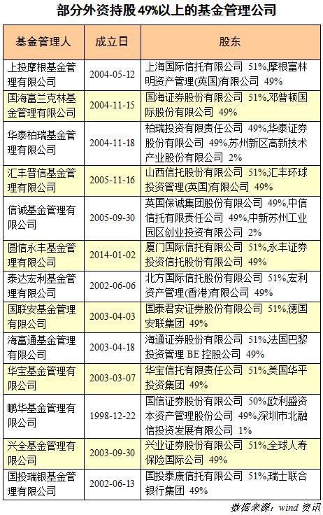 2016年年底,第一创业公告称将以人民币3.07亿元的价格收购摩根大通持有的一创摩根33.30%的股权。 另外,国联证券今年7月6日宣布,向苏格兰皇家银行收购在中国从事投资银行业务的华英证券余下33.3%股权,总价3.54亿元人民币。完成交易后,国联证券将全资拥有华英证券。 业内分析师曾指出,合资券商不仅因为牌照原因会使业务开展受到一些,而且在业务资源的获取能力上也稍显劣势。现有的合资券商中,除了早期成立的中金公司、高盛高华、瑞银证券3家拥有较为齐全的业务资格外,其余券商大多只是获得中方券商股东的投行业务资格。 除了市场用真金白银堆出的热烈反响,一些外资机构也积极支持。“我们继续寻求增持瑞银证券股权。”瑞银中国战略委员会钱于军对放宽政策回应道。事实上,瑞银集团早在今年初便计划提高对合资证券公司瑞银证券的持股比例至当时的上限49%。瑞银证券官网显示,银行有限公司目前持股比例为24.99%,位居第二大股东。 值得一提的是,美国资管巨头诸如Vanguard 很早就表现出对在华设立公募基金的兴趣,但又不愿意合资怕影响公司经营管理风格。按照新规,51%控股三年之后可实现独资,某位国际对冲基金协会中国区负责人表示,有望以独资的形式在华开展公募业务,对于海外公募基金来说是个很好的信号。 此外,不少基金公司早已引进外资做大股东,且持股比例紧贴原有的49%上限。根据Wind数据统计,目前境内共有41家中外合资基金公司,不少外资持股比例达到了49%。