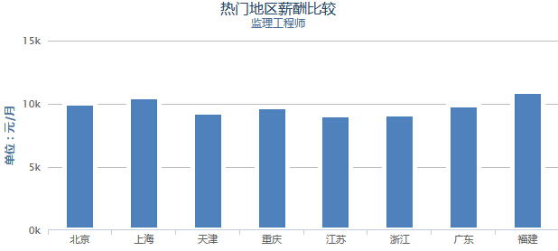 北上广加上沿海省份都是监理工程师的热门地区。薪资情况::10013元、上海:10543元、天津:9323元、重庆:9763元、江苏:9143元、浙江:9145元、广东:9871元、福建:10929元。 工程监理工资按工作经验统计,其中应届毕业生工资¥3618,0-2年工资¥4206,3-5年工资¥4980,6-7年工资¥5742,8-10年工资¥6058,10年以上工资¥7058.